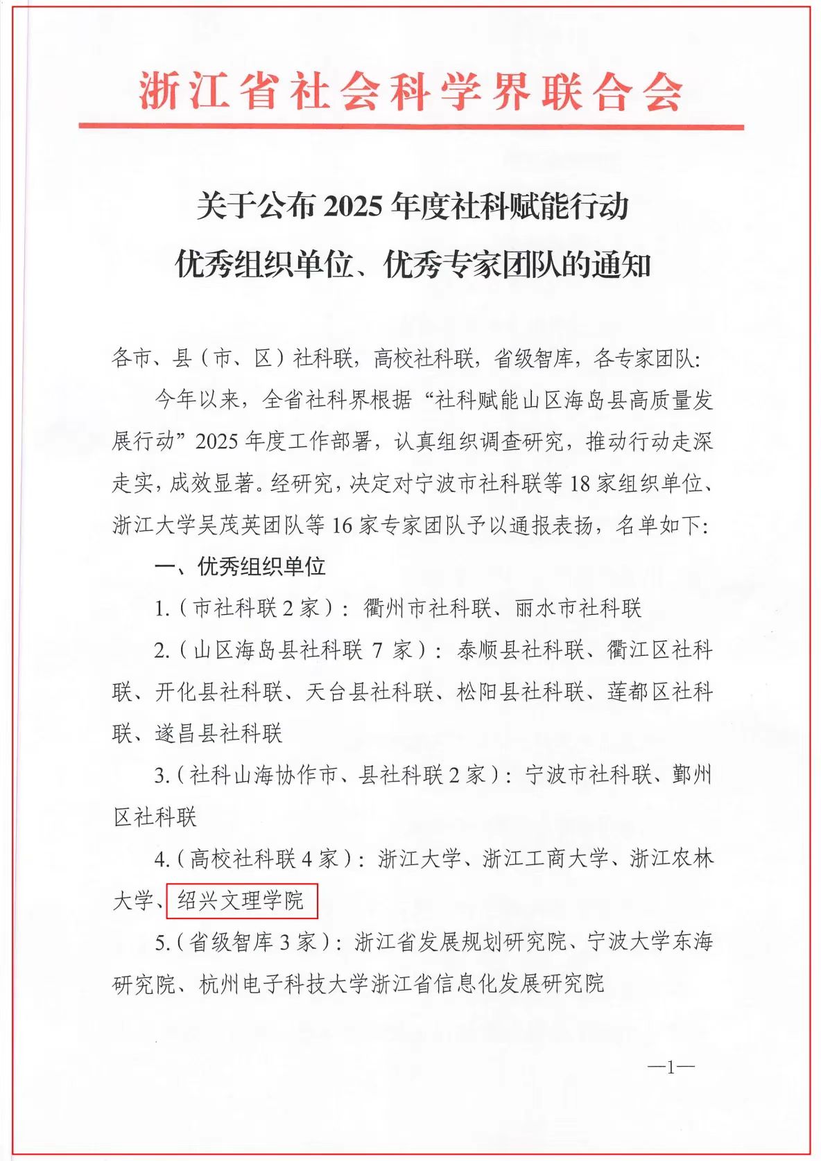 11月26日上午,浙江省社科联在丽水市组织召开2025年“社科赋能山区海岛县高质量发展行动”工作推进会,对全省18家组织单位、16家专家团队予以通报表扬并颁奖,以表彰先进,推动行动走深走实。绍兴文理学院社科联获评2025年度浙江省社科赋能行动优秀组织单位,崔凤军团队获评优秀专家团队。